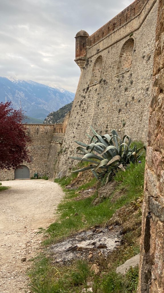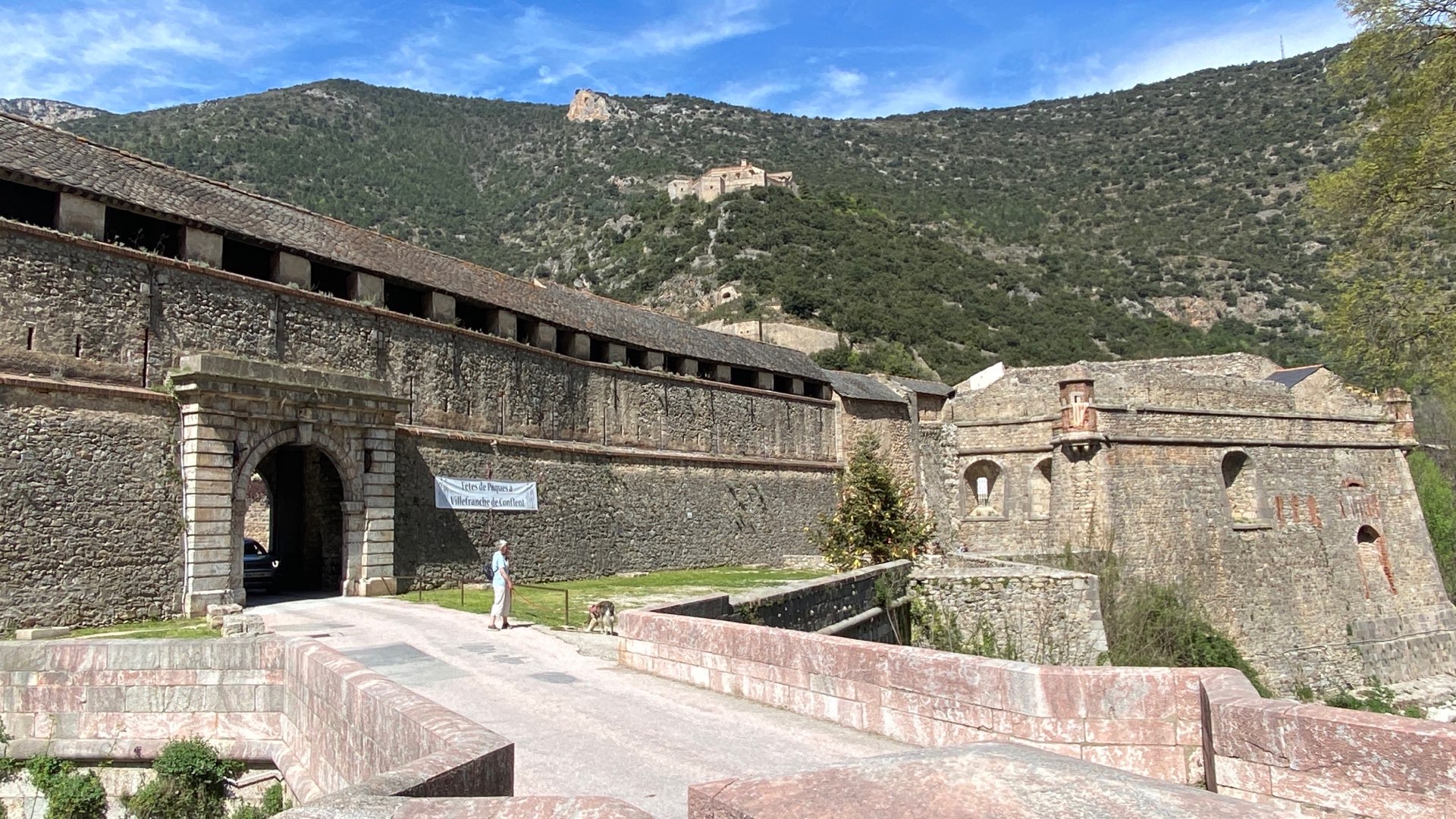 Die Außenmauern von Villefranche-de-Conflent. Oben auf dem Berg die Festung Fort Liberia.
