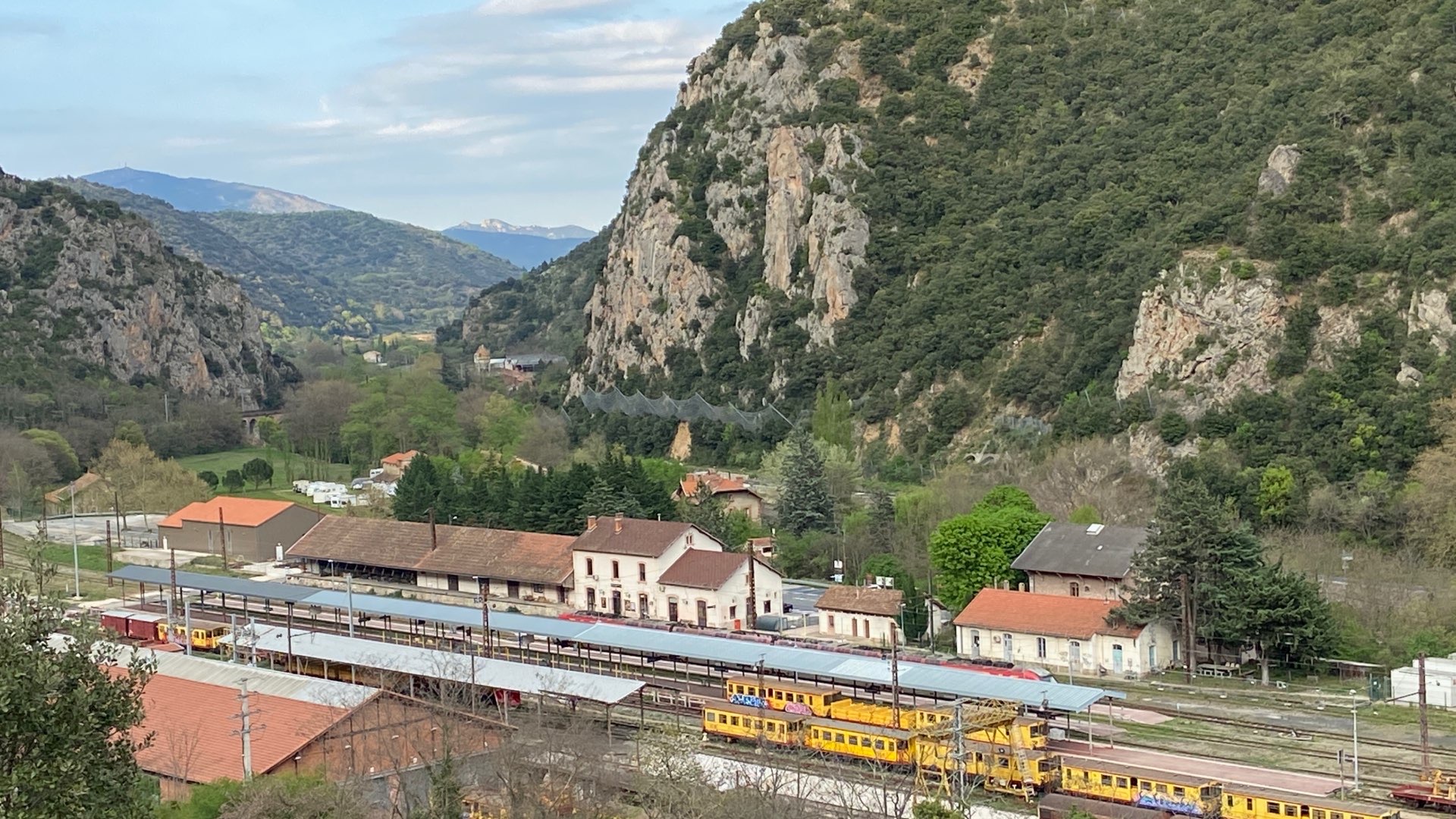 Wir haben einen großen Parkplatz neben dem Bahnhofsgelände angesteuert. Nach Einwurf von 5 € hat uns der dortige Parkautomat 24 Stunden an Aufenthalt zugestanden. An diesem Bahnhof startet auch der gelbe Zug seine 60 km lange Fahrt durch die Pyrenäen. Nach Aussage des lokalen Tourismusbüros wird der Betrieb des Train jaune dieses Jahr erst am 8. Mai wieder aufgenommen.