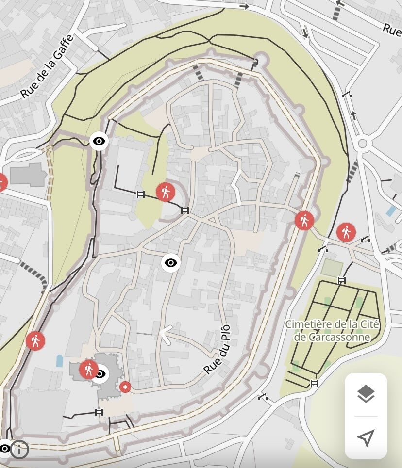 Es gibt eine innere und eine äußere Befestigungsmauer. Auf der Karte sind die beiden Befestigungsmauern als dicke graue Linien erkennbar. Carcassonne war also doppelt geschützt. Das kann man sehr gut auf nachfolgendem Bild erkennen.