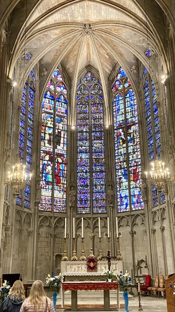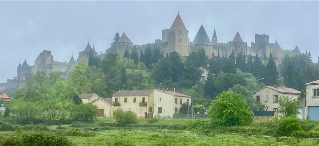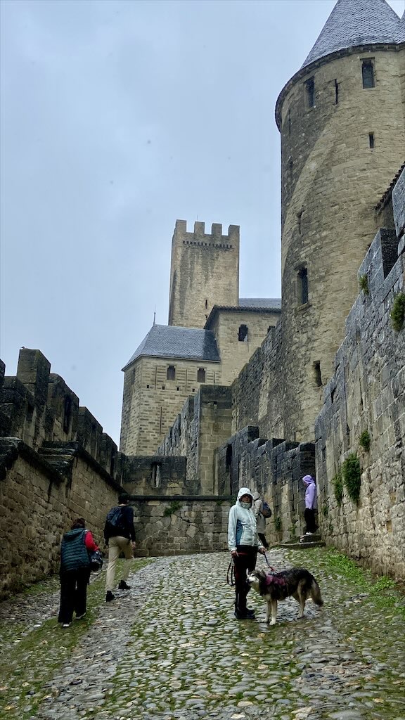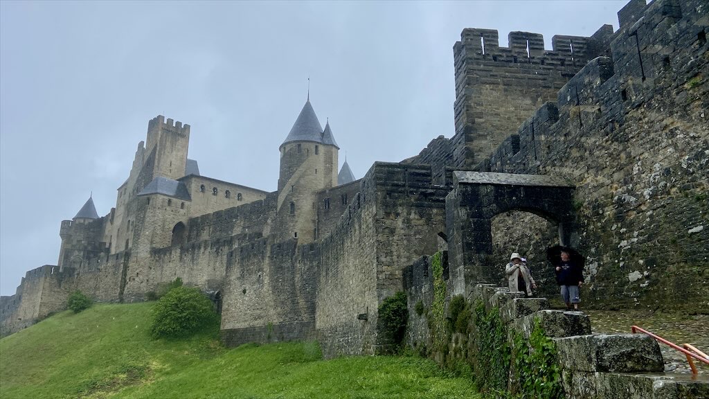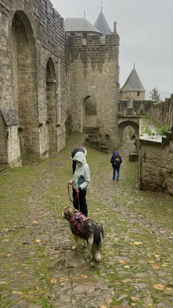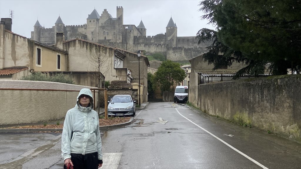 Ein Ende des Regens war nicht in Sicht. Eine von der App vorhergesagte Reduzierung der Regenwahrscheinlichkeit für die nächsten zwei Stunden bewahrheitete sich nicht. Wir haben zügig unsere Regenjacken und -hosen angezogen und sind dann gestartet. Zur Festungsanlage von Carcassonne mussten wir nur 1,5 km gehen. Wir konnten direkt vom Stellplatz aus auf einem von den Straßen weit ab gelegenen Fußweg gehen. Das war sehr angenehm für uns aber auch für Alma. Zur Festungsanlage steigt man hoch über eine Vielzahl von Treppchen.