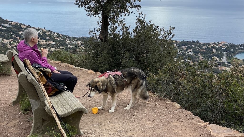 Zunächst führte die Wanderung uns an eine steile, aus Beton gegossene Treppe. Man kam schon etwas ins Schnaufen bis man oben war. Dort oben verlief die Strecke zunächst durch eine Ferienhaussiedlung, welche sich hoch oben am Berghang befindet. Etwas später verließen wir die Siedlung und der Weg wandelte sich in einen breiten Forstweg, der vermutlich auch hilft im Falle eines Waldbrandes die Feuerlöschfahrzeuge auf den Gebirgskamm hochzufahren. Die Sicht auf die Bucht von Agay verbesserte sich von Serpentinenkurve zu Serpentinenkurve.