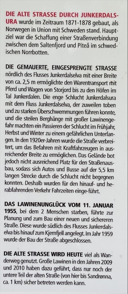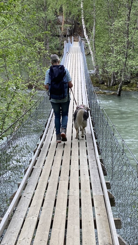 Da der Weg bisher recht eben verlief, waren wir gut vorangekommen und hatten gegen Mittag die Junkerdalsura Schlucht bereits wieder verlassen. Es war noch sonnig, also beschlossen wir den auf obigem Tourenbild unten zu sehenden Rundweg auch noch zu gehen. Dazu mussten wir drei Hängebrücken passieren.